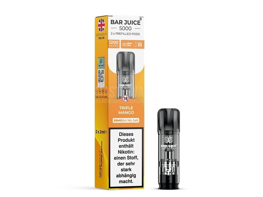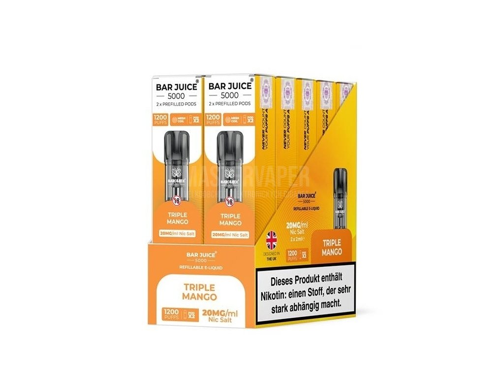 Parametry a specifikaceVýrobce: Bar Juice Žhavící hlava: Integrovaná v Podu Materiál spirálky: Mesh Objem: 2ml Styl potahování: MTL (Mouth-to-Lung) Příchuť: Triple Mango (Mango) Obsah nikotinové soli: 20mg/ml Způsob plnění: Nelze, již předplněné Legislativa: TPD kompatibilní