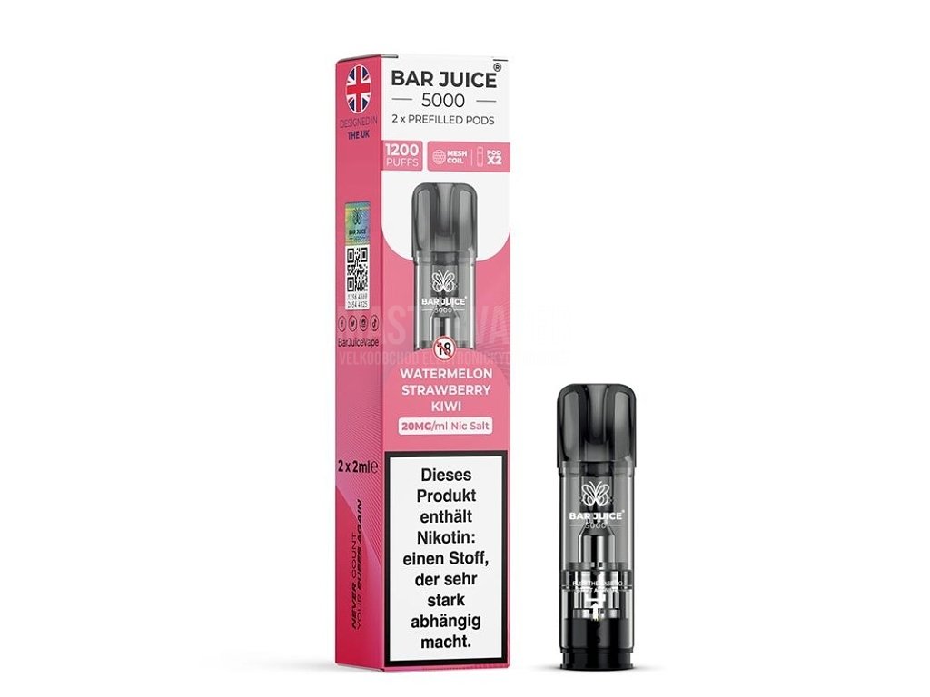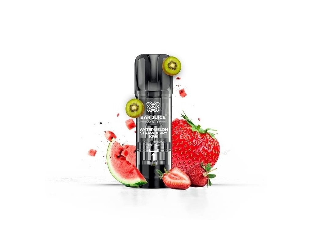 Parametry a specifikaceVýrobce: Bar Juice Žhavící hlava: Integrovaná v Podu Materiál spirálky: Mesh Objem: 2ml Styl potahování: MTL (Mouth-to-Lung) Příchuť: Watermelon Strawberry Kiwi (Vodní meloun, Jahoda, Kiwi) Obsah nikotinové soli: 20mg/ml Způsob plnění: Nelze, již předplněné Legislativa: TPD kompatibilní