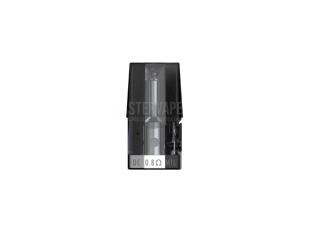 Pod Cartridge sloužící jako zásobník pro Vaší oblíbenou náplň (e-liquid), která v tomto případě slouží zároveň i jako náustek a nosič samotné žhavící hlavy. V tomto případě se jedná o dvouspirálkovou žhavící hlavu s celkovým odporem 0,8Ω se kterou si maximálně vychutnáte Váš oblíbený e-liquid. Tato Pod Cartridge s uvedeným odporem vytváří opravdu solidní dým a je vhodná ke klasickému způsobu potahování (MTL) jako u klasických cigaret. Je nutné také dodat, že tato Cartridge má velmi solidní objem vzhledem k malým rozměrům e-cigarety, a to rovné 3ml. Její plnění je velmi snadné a provádí se sejmutím boční silikonové krytky. Její instalace je velmi jednoduchá a provádí se pouhým zasunutím do těla cigarety a o její správné držení se postará dvojice zabudovaných magnetů. Stav hladiny je díky průhlednosti Cartridge dobře vidět, a tak vždy vidíte, jak na tom aktuálně jste a jestli můžete třeba vyrazit na celodenní výlet.