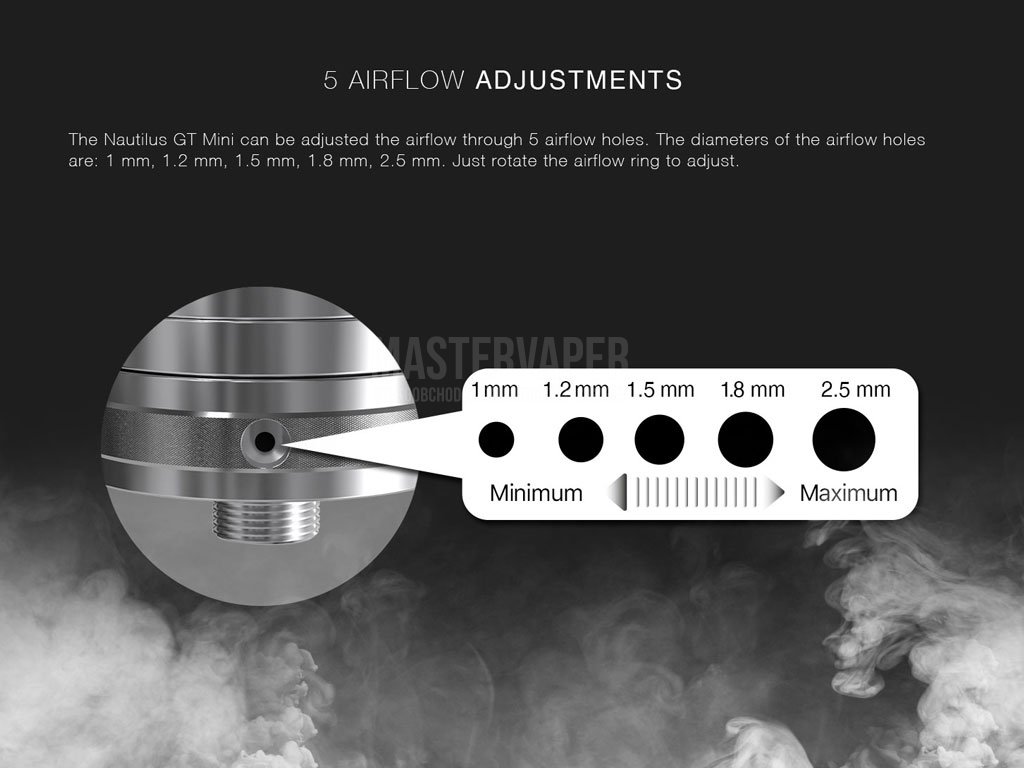 Dokonalé Airflow Nastavitelný přívod vzduchu (Airlow) je samozřejmostí, a to v dokonalém provedení, které je přesně odstupňované celkem pěti různě velikými průchody. Průchod vzduchu může být také celkově uzavřen. Díky tomu to provedení je Nautilus GT Mini primárně určen pro klasický styl potahování MTL, jaký známe u klasických cigaret, nicméně v kombinaci se správně zvolenou žhavící hlavou a při plném otevření přívodu vzduchu lze snadno použít i pro přímý styl potahování do plic (DL). |