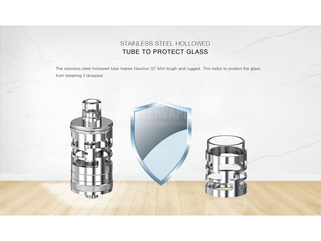 Kvalitní konstrukce Clearomizer aSpire Nautilus GT Mini je postaven na kvalitní základně z ušlechtilé oceli, která je doplněna o kvalitní pyrexové sklo. Celkový objem pro náplň tak činí až 2,8ml zásobního prostoru |