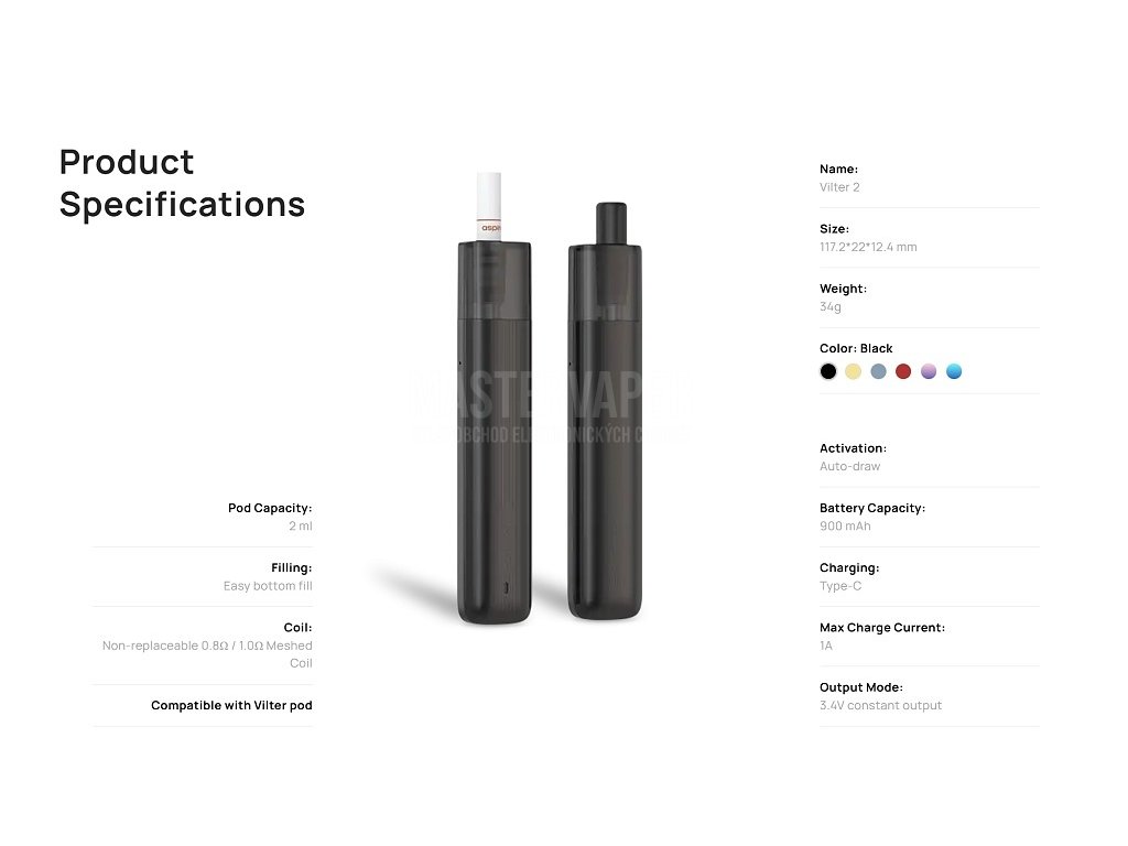 Parametry a specifikaceRozměry: 117,2 x 22 x 12,4 mm Kapacita baterie: 900mAh (integrovaná) Režimy: Bypass Metody spínání potahu: automatické žhavení potahem Výstupní napětí: konstantní 3,4V Podporovaný odpor: 0,8Ω (kompatibilní s 1Ω pody Aspire Vilter) Způsob nabíjení: USB-C port (5V/1A) Regulace výkonu: ne (konstantní napětí) Objem Pod Cartridge: 2ml Styl potahování: MTL (mouth-to-lung), utažený potah Odpor žhavících hlav: 0,8Ω (integrovaná mesh hlava) Regulace přívodu vzduchu (Airflow): ne (přednastaveno) Hmotnost: 34g Barva: Black (Černá) Materiál: kov (tělo), plast (pod) |