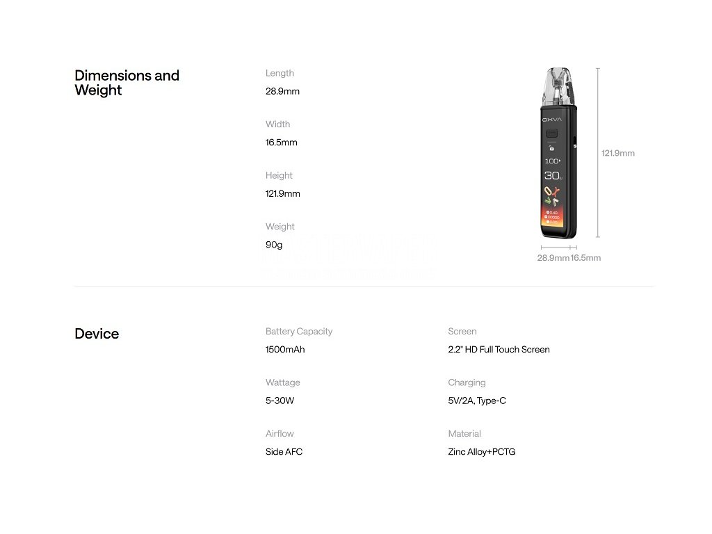 Parametry a specifikaceRozměry: 121,9 x 28,9 x 16,5 mm Kapacita baterie: 1500 mAh (integrovaná) Režimy: Smart VW, Eko režim, Super Pulse System Metody spínání potahu: Auto-draw (senzorové) + tlačítkové ovládání Výstupní napětí: 3,0-4,2V (automaticky řízeno čipsetem) Výstupní výkon: 5-30W (nastavitelný) Podporovaný odpor: 0,3-3,0Ω Způsob nabíjení: USB-C, 5V/2A (rychlonabíjení) Regulace výkonu: automatická + manuální Objem Pod Cartridge: 3 ml (TPD verze 2 ml) Styl potahování: MTL (mouth-to-lung) / RDL (restricted direct-lung) Odpor žhavících hlav v balení: 0,6Ω / 0,8Ω (XLIM V3) Regulace přívodu vzduchu (Airflow): Boční, plynule nastavitelný Hmotnost: 90g Barva: Metal Grey, Metal Silver, Cherry Pink, Mint Green, Ultra Carbon, Mocha Brown, Midnight Black, Bordeaux Red Materiál: Zinkové slitina + PCTG |