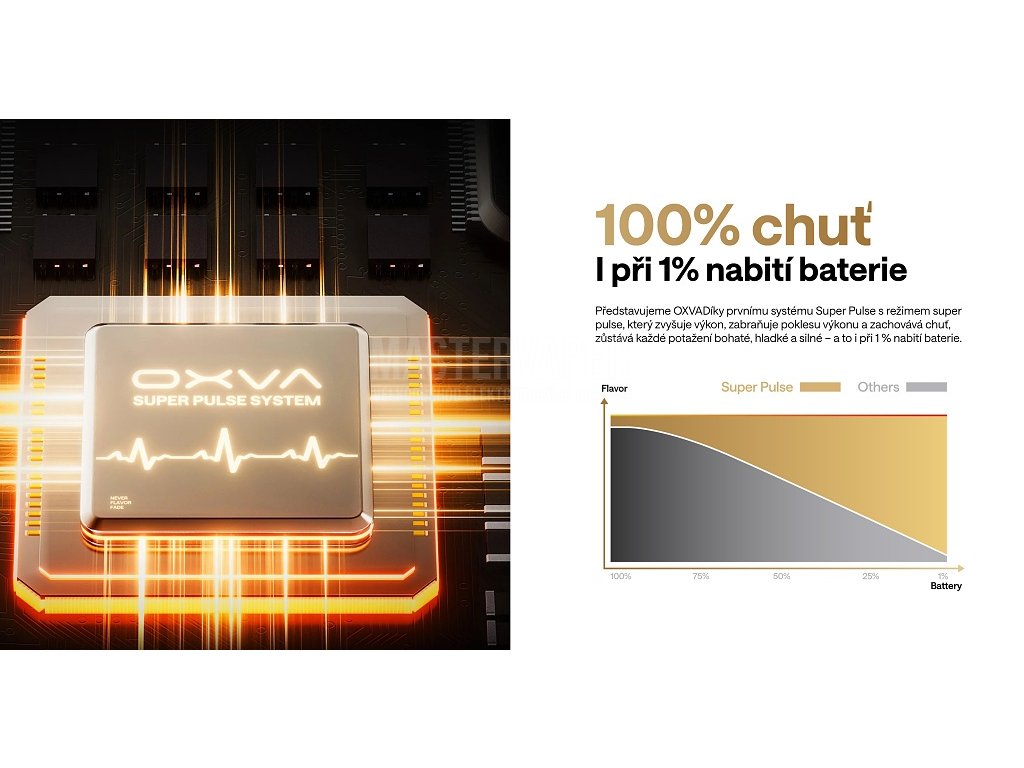 Špičkový výkonSuper Pulse System čipset zajišťuje stabilní výstupní výkon od 5 do 30 wattů napříč celým rozsahem nabití baterie. Pokročilá pulzní technologie udržuje konstantní intenzitu chuti i při 1% zbývající kapacity, čímž eliminuje slabé potahy typické pro klasické zařízení. Chipset inteligentně vyrovnává produkci páry a chuti pro optimální zážitek. |