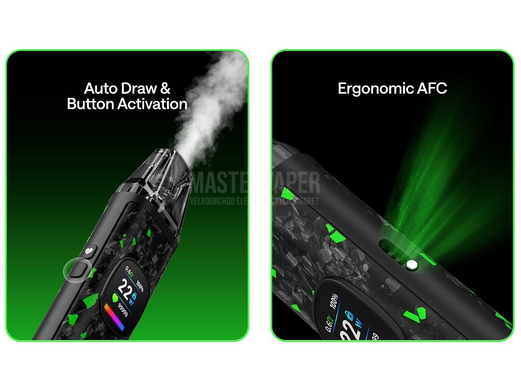 Oceněný designLuxusní konstrukce z kombinace zinkové slitiny, karbonu/IML a PCTG materiálů s elegantními barevnými variantami včetně luminiscenčního karbonu. Oceněno prestižní Muse Design Awards za nejkrásnější elektronickou cigaretu roku 2025 díky dokonalému spojení funkčnosti a estetiky. |