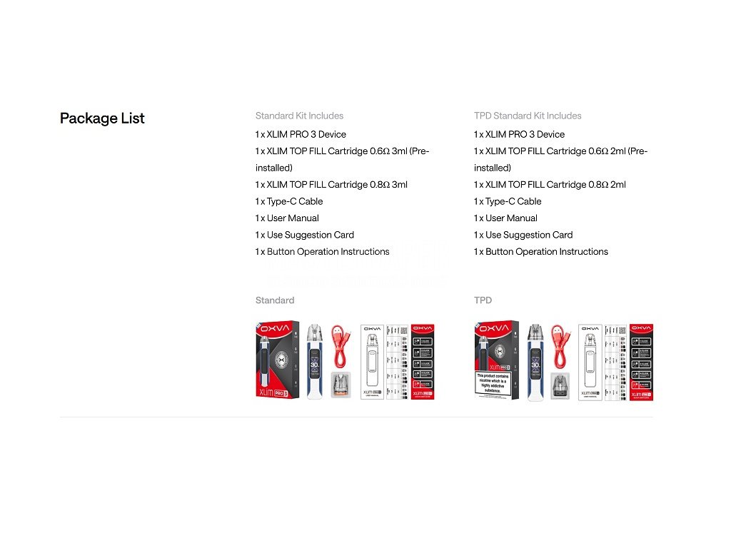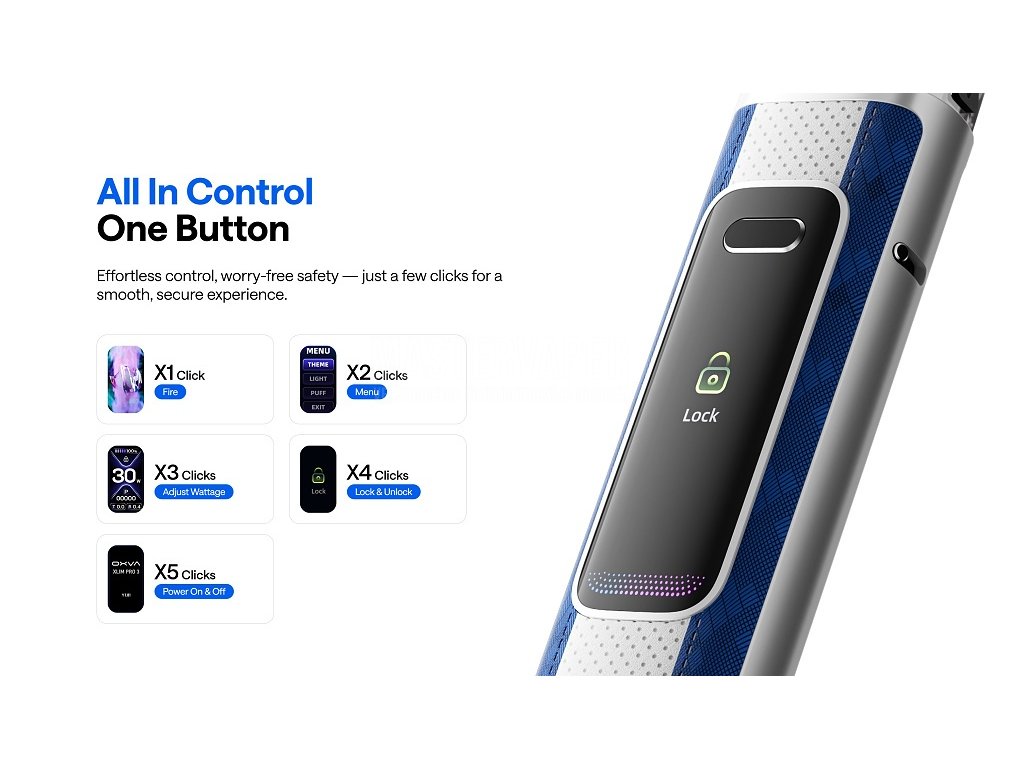 Elektronická cigareta je vybavena rychlonabíjecím portem USB-C s podporou 5V/2A, který dokáže nabít baterii na 80% kapacity za pouhých 30 minut a plné nabití trvá přibližně 45-60 minut. OXVA XLIM Pro 3 je dodávána s novými XLIM V3 top-fill Pod Cartridgemi s kapacitou 2 ml (verze TPD), s odpory 0,6Ω a 0,8Ω. Lze však dokoupit hned několik variant odporů: 0,4Ω pro volnější RDL styl, 0,6Ω a 0,8Ω pro univerzální použití mezi MTL a RDL, a 1,2Ω pro těsné MTL potahování s nikotinovými solemi. V balení tak naleznete Pod Cartridge pro okamžité vyzkoušení různých stylů vapování. Zařízení disponuje inteligentním Smart Wattage režimem, který automaticky nastaví optimální výkon podle vloženého podu a odporu, což eliminuje riziko připálení a zajišťuje perfektní chuť při každém potahu. Samozřejmostí je pak i manuální nastavení výkonu pomocí jednoho tlačítka. Nastavení je velmi jednoduché, rychlé a velice intuitivní. Horizontální regulace přívodu vzduchu (airflow) umístěná na boku vedle tlačítka umožňuje plynulé přizpůsobení tahu od velmi těsného MTL až po vzdušnější RDL podle individuálních preferencí. Elektronická cigareta Oxva XLIM Pro 3 je dostupná v devíti prémiových barevných provedeních včetně Black Leather, Brown Leather, Pro Carbon, Sky Blue, Race Red a dalších variant, které kombinují moderní estetiku se špičkovým technickým zpracováním a kvalitními materiály jako zinkovou slitinu a PCTG plast.