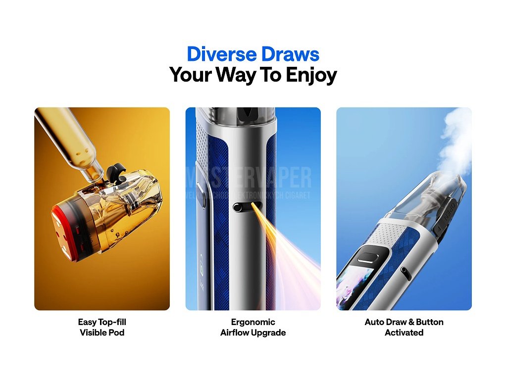 Vlajková elektronická cigareta s 1,05" HD barevným displejem a Pulse System technologií pro 80% konzistenci chuti i při nízkém nabití. Výkonná 1500 mAh baterie s rychlonabíjením USB-C za 30 minut, výkon 5-30W, Smart Wattage režim. Kompatibilita se všemi XLIM pody (V2, V3, EZ) s odpory 0,4-1,2Ω. UniTech 2.0 prodlužuje životnost podů o 30% a zvyšuje chuť o 50%. Horizontální airflow, duální aktivace (auto-draw + tlačítko). Rozměry 119,9×25,7×15mm, hmotnost 77g. Ideální pro MTL i RDL styl. Nejlepší pod systém 2025.