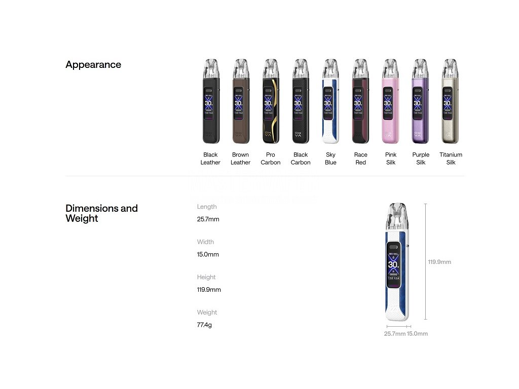 Prémiový designOXVA XLIM Pro 3 disponuje robustní konstrukcí z vysoce kvalitní zinkové slitiny v kombinaci s odolným PCTG plastem pro pody. Klasický zploštělý pero-stylový design s jemně zaoblenými rohy zajišťuje pohodlné držení a přirozený úchop v ruce. Zařízení je dostupné v devíti atraktivních variantách včetně prémiových kožených povrchů a moderních hedvábných textur. |
