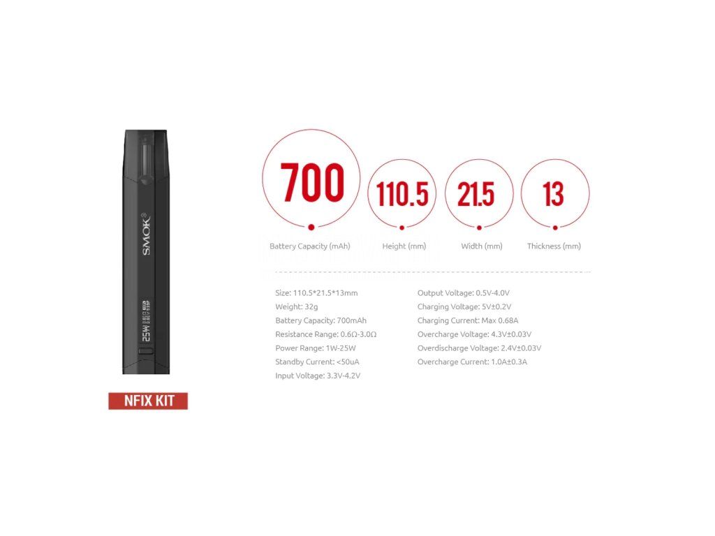 Pro svůj neotřelý design a přidanou hodnotou v podobě OLED displeje se elektronická cigareta Smoktech Nfix řadí mezi další All-in-one zařízení, u kterých se nemusíte vůbec o nic starat. Byla navržena s důsledkem využití každé části a tak není divu, že její váha je pouhých 32g a její rozměry 110,5 x 21,5 x 13mm jsou vskutku kompaktní. Vejde se tak do každé ruky a její pohodlné přenášení například v kapse je samozřejmostí.