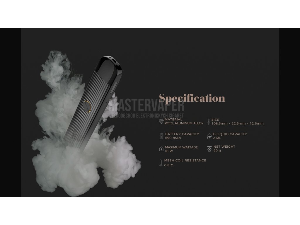 Automatická Pod elektronická cigareta s celkovým výkonem 18W, cartridge s objemem 2ml, baterie 690mAh, USB-C nabíjení, hliníkový obal.