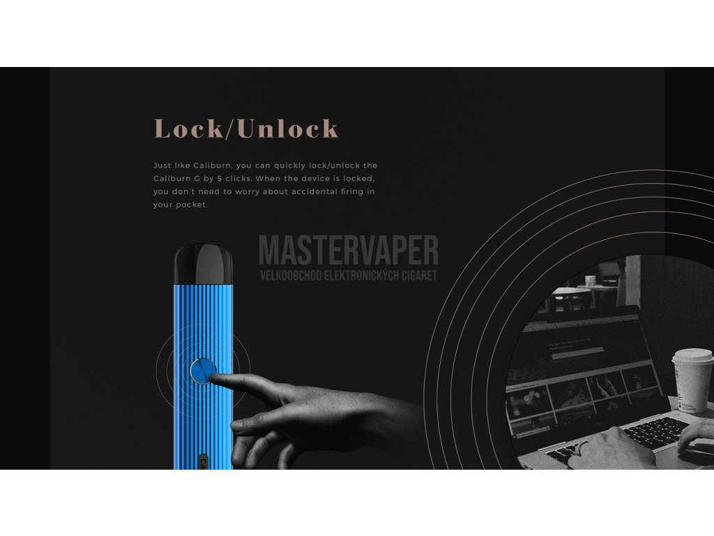 Caliburn G také disponuje led indikací stavu nabití baterie, což jistě oceníte v případě, že chcete mít přehled o stavu nabití, pokud třeba někam cestujete. Samotné ovládání Caliburn G je velmi jednoduché a probíhá pomocí hlavního tlačítka, umístěného na boční straně cigarety. Nenechte se ovšem mýlit, stejně jako u předchozího modelu lze cigaretu používat i v plně automatickém režimu, kdy pouhým potažením dojde k aktivaci žhavící hlavy a vy můžete v klidu potahovat i bez aktivace tlačítka. Samozřejmostí je pak vypnutí a zapnutí klasickým 5-ti klikem.