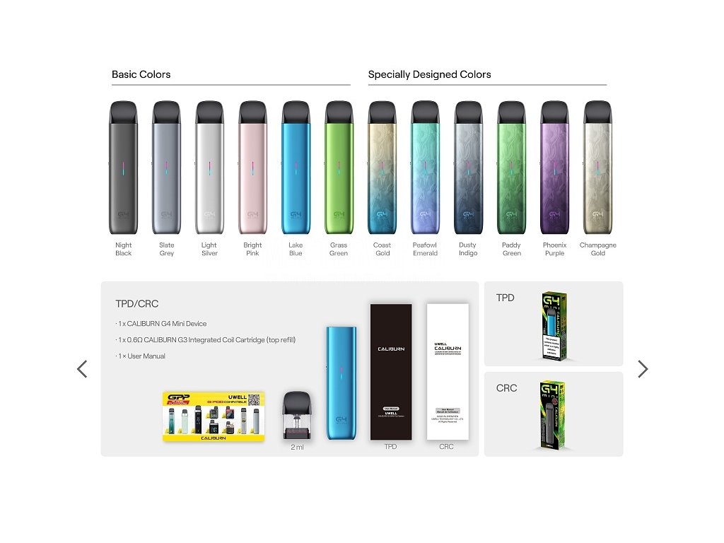 Uwell Caliburn G4 Mini Pod Kit v různých barevných variantách - minimalistický design elektronické cigarety
