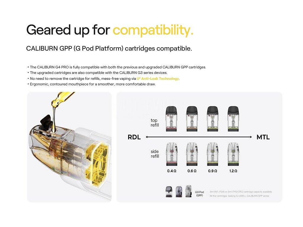 Cartridge GPPNové cartridge Caliburn GPP s objemem 3 ml nabízejí snadné plnění ze spodní strany a průhledný materiál PCTG pro kontrolu hladiny e-liquidu. Magnetické uchycení zajišťuje pevné spojení s tělem a jednoduchou výměnu. Cartridge je možné nasadit dvěma směry, přičemž každá orientace nabízí odlišnou šířku sacího otvoru pro jemnější ladění airflow podle vašich preferencí. |
