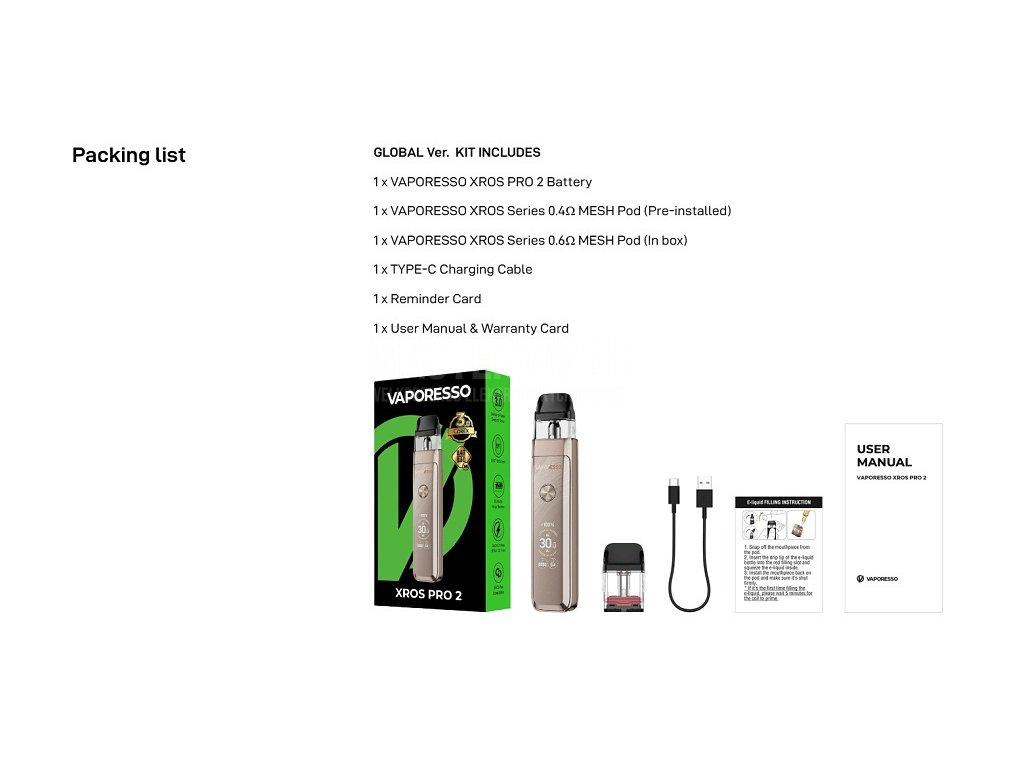 - 1x Tělo Vaporesso XROS Pro 2 (integrovaná baterie 2000 mAh)