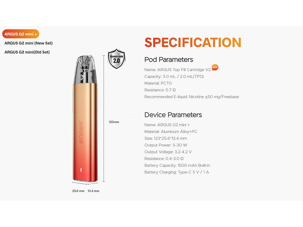 Výrobce VooPoo přichází s inovovanou verzí oblíbeného modelu G2 Mini, která nese označení G2 Mini+. Tato vylepšená verze přináší zvýšenou kapacitu baterie a ještě lepší výkon pro náročnější uživatele. VooPoo Argus G2 Mini+ je kompaktní a výkonná elektronická cigareta pro MTL/RDL styl vapování, ideální pro každodenní nošení, která nabízí vynikající poměr ceny a výkonu a je vybavena vylepšenou baterií o kapacitě 1500 mAh, poskytující o 25 % více energie než původní model po celý den i při náročnějším používání. Díky svému ergonomickému designu a lehké konstrukci z hliníkové slitiny padne pohodlně do ruky a její intuitivní ovládání zaručuje snadné používání i pro začátečníky, navíc disponuje nastavitelným přívodem vzduchu (Airflow) pro personalizaci vapovacího zážitku, automatickou regulací výkonu v rozmezí 5-30 W (dle použité Pod Cartridge) a inteligentními ochrannými funkcemi pro bezpečné používání, jako je ochrana proti přehřátí, zkratu a nadměrnému vybíjení baterie. Díky Pod Cartridgím s objemem 3 ml a odporem 0,7 ohm nabízí bohatou produkci páry a zároveň dostatečnou zásobu e-liquidu pro dlouhodobé vapování.