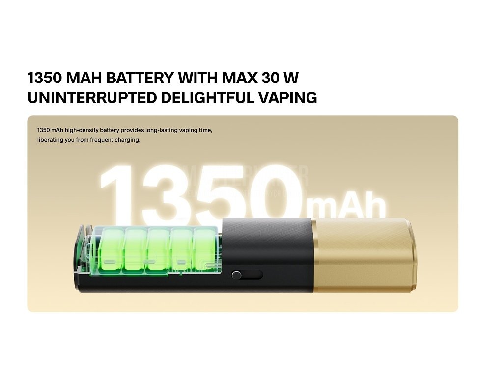 Výkonná baterieIntegrovaná lithium-iontová baterie s kapacitou 1350mAh poskytuje spolehlivou energii pro celodenní vapování. Vysoká kapacita baterie umožňuje stovky potahů na jedno nabití, zatímco pokročilé ochranné obvody zajišťují bezpečný provoz a dlouhou životnost baterie. |
