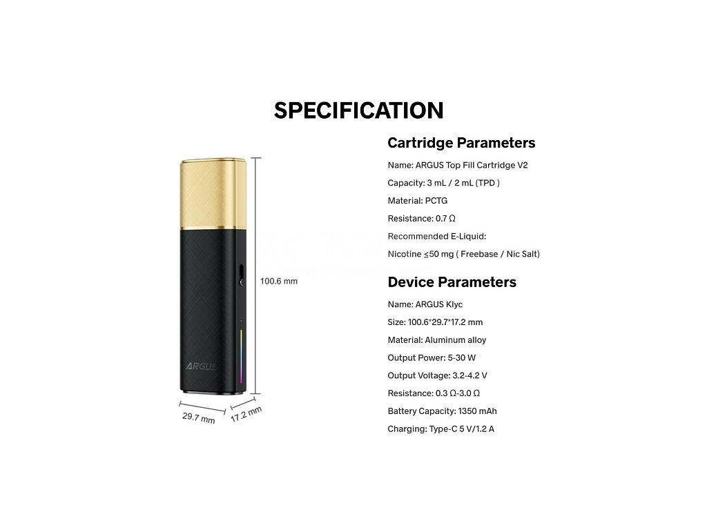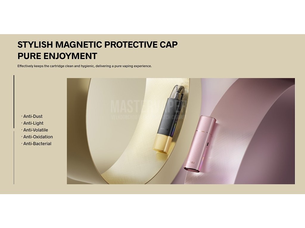 Technologické srdce Argus Klyc tvoří pokročilý čip s inteligentním rozpoznáváním, který vyhodnocuje nejen odpor použitého podu, ale také sílu potahu a automaticky upravuje parametry pro optimální výkon. Technologie iCOSM Code 2.0 zajišťuje efektivní nasycování vaty e-liquidem, rovnoměrné odpařování a okamžité žhavení pro bohatý chuťový zážitek. Praktické vrchní plnění podu eliminuje nutnost vyjímání cartridge z těla zařízení – stačí odklopit silikonovou krytku a doplnit oblíbenou náplň. Ergonomický tvar a kompaktní rozměry 100,6 x 29,7 x 17,2 mm činí z Argus Klyc ideálního společníka pro každodenní nošení. Boční posuvník pro regulaci přívodu vzduchu umožňuje nastavit styl vapování od volnějšího pusa-plíce až po těsnější MTL styl. Magnetické připojení víčka představuje praktické řešení – během vapování jednoduše přichytíte víčko na spodní část zařízení pomocí magnetu, takže se nikdy neztratí. Argus Klyc tak kombinuje stylový vzhled, pokročilou funkčnost a maximální pohodlí používání pro náročné uživatele elektronických cigaret.