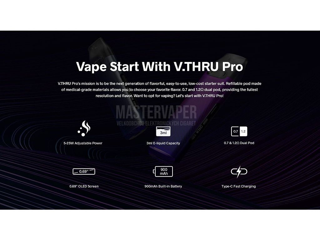 Elektronická cigareta Voopoo V.THRU Pro Kit je snadno použitelná a dostupná startovací sada, který má malé rozměry, ale velký výkon. Je napájena vestavěnou baterií o kapacitě 900mAh s rychlonabíjecím portem typu USB-C 5V/1A. Díky beztlačítkovému ovládání a prvotřídnímu designu se V.THRU Pro snadno používá, přenáší a její konstrukční provedení přináší opravdu příjemný požitek z vapování.