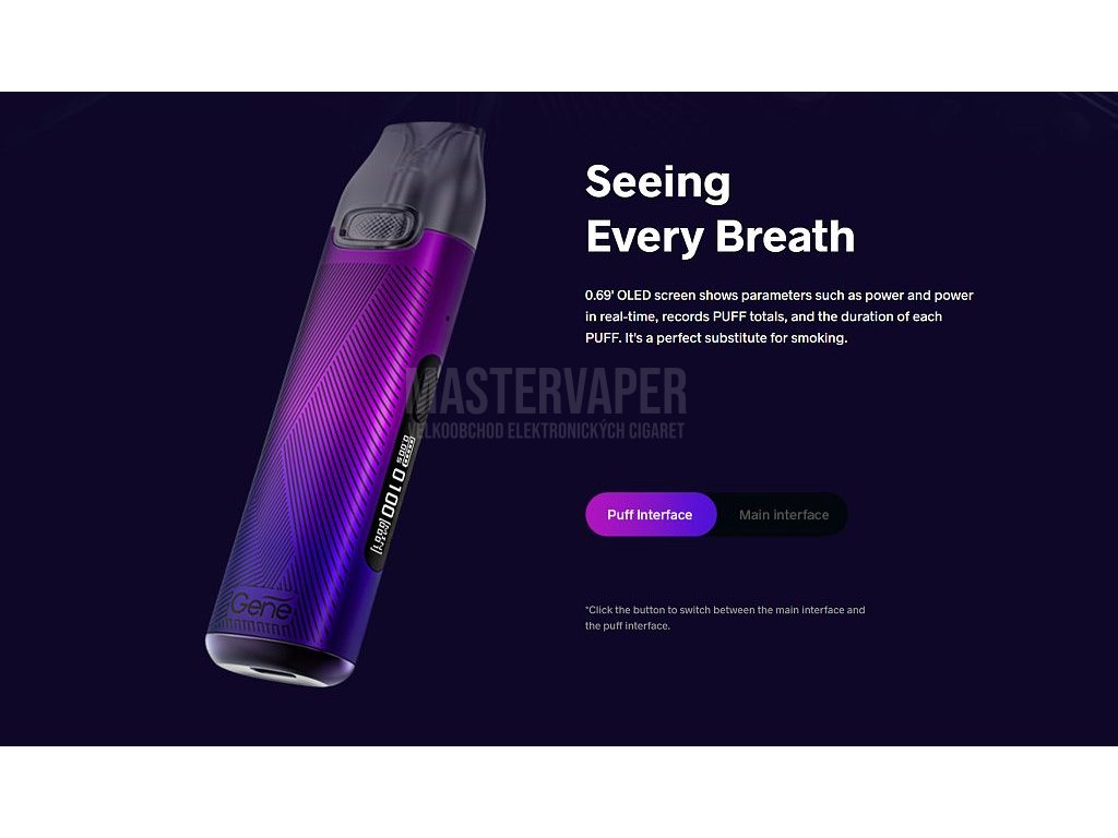 Cigaretu pohání čip GENE, který dodává konstantní výstupní napětí. Těšit se tak můžete na dokonale hladký a příjemný potah, nebo na možnost regulace výstupního výkonu. Ten lze regulovat v rozmezí 5 - 25 W pomocí jednoho jediného tlačítka. Na 0,69 palcovém OLED displeji se zobrazují veškěré potřebné informace o zařízení. Elektronická cigareta disponuje inteligentním režimem dětské pojistky, aby se zabránilo náhodnému spuštění dětmi. Samotná Pod Cartridge disponuje magnetickým uchycením a její doplňování a případná výměna je tak otázkou několika málo vteřin.