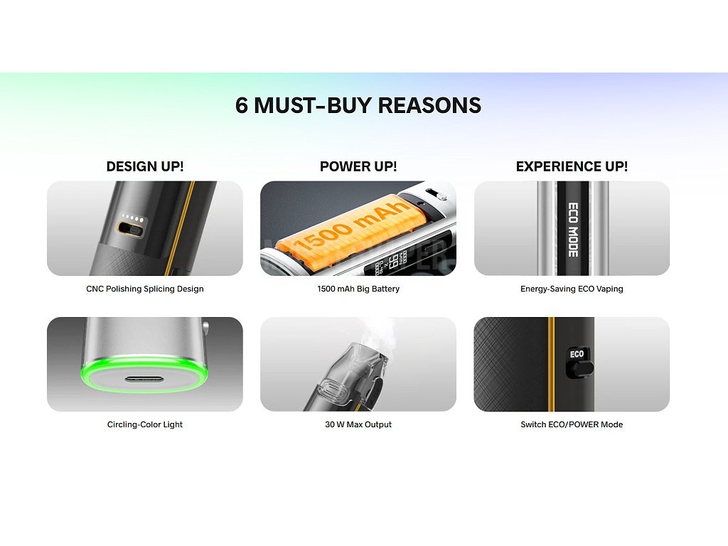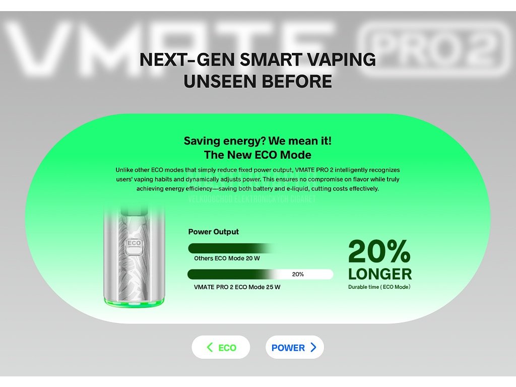 Duální režimyManuální přepínač na předním panelu umožňuje snadné přepínání mezi režimem POWER s regulací výkonu 5-30W a úsporným ECO režimem s automatickým nastavením. ECO režim optimalizuje spotřebu baterie při zachování výborného vapovacího zážitku. |