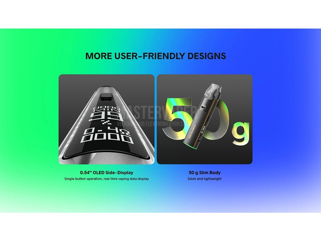 OLED displejBoční OLED displej poskytuje přehledné zobrazení všech důležitých informací během vapování. Černobílý displej s dvěma rozhraními zajišťuje snadnou orientaci a kontrolu nad všemi parametry zařízení. V ECO režimu se automaticky ztlumí pro úsporu energie. |