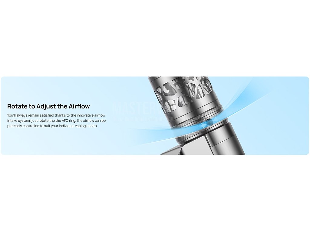 Regulace přívodu vzduchuPřesný systém regulace přívodu vzduchu s otočným regulačním kroužkem umožňuje plynulé nastavení od velmi utaženého MTL po vzdušné DL vapování. Kvalitní mechanismus zajišťuje precízní nastavení volnosti potahu podle preferencí a typu e-liquidu pro optimální chuťový zážitek. |