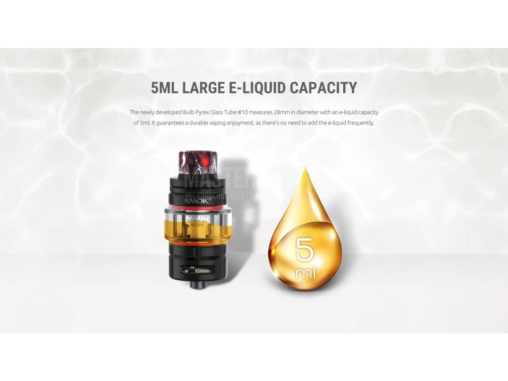 Samotnou kapitolu pak představuje Nízkoodporový Tank clearomizer Smok TFV16 Lite, který je součástí tohoto setu. Clearomizer Smoktech TFV16 disponuje objemem celých 5ml zásobního prostoru pro e-liquid. Zároveň s tímto clearomizerem přichází zcela nové žhavící hlavy nesoucí stejné označení TFV16, které jsou osazeny hitem poslední doby, a to Mesh spirálkami, díky kterým se dá dosáhnout opravdu velké produkce páry. Samozřejmostí je pak možnost regulace přívodu vzduchu. Průchod může být také téměř celkově uzavřen. Díky tomu to provedení je Smok TFV16 primárně určen pro oblíbený styl přímého potahování DL, nicméně v kombinaci se správně zvolenou žhavící hlavou a při vyšším omezení přívodu vzduchu lze snadno použít i pro klasický styl MTL, kdy potahujete jako z klasické cigarety. Plnění e-liquidem je rovněž velmi praktické a probíhá pootočením horní části clearomizeru proti směru hodinových ručiček, kde se skrývá samotný otvor pro plnění.