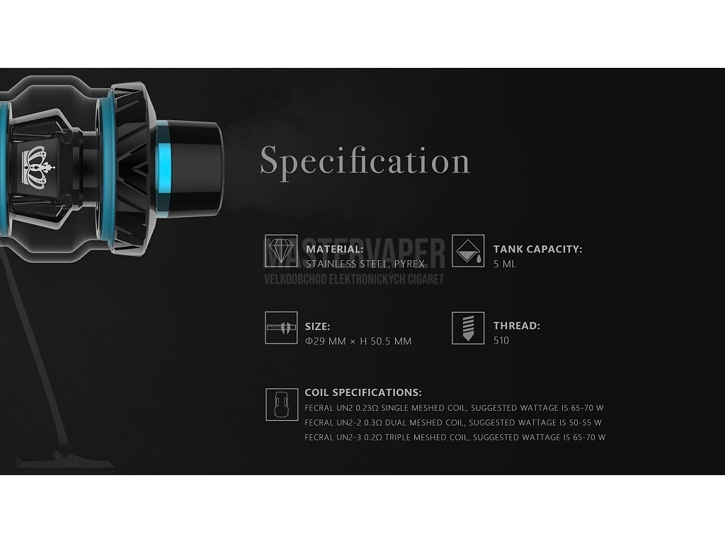Výkonný nízkoodporový Clearomizér z nerezové oceli a pyrexu, vhodný především pro DL vapování. Objem 5ml. Podpora žhavících hlav Uwell UN2, UN2-2, Plynulá regulace přívodu vzduchu (Airflow), horní plnění e-liquidem, rozměry 50,5mm x 29mm, závit 510. 2x žhavící hlava v Setu.