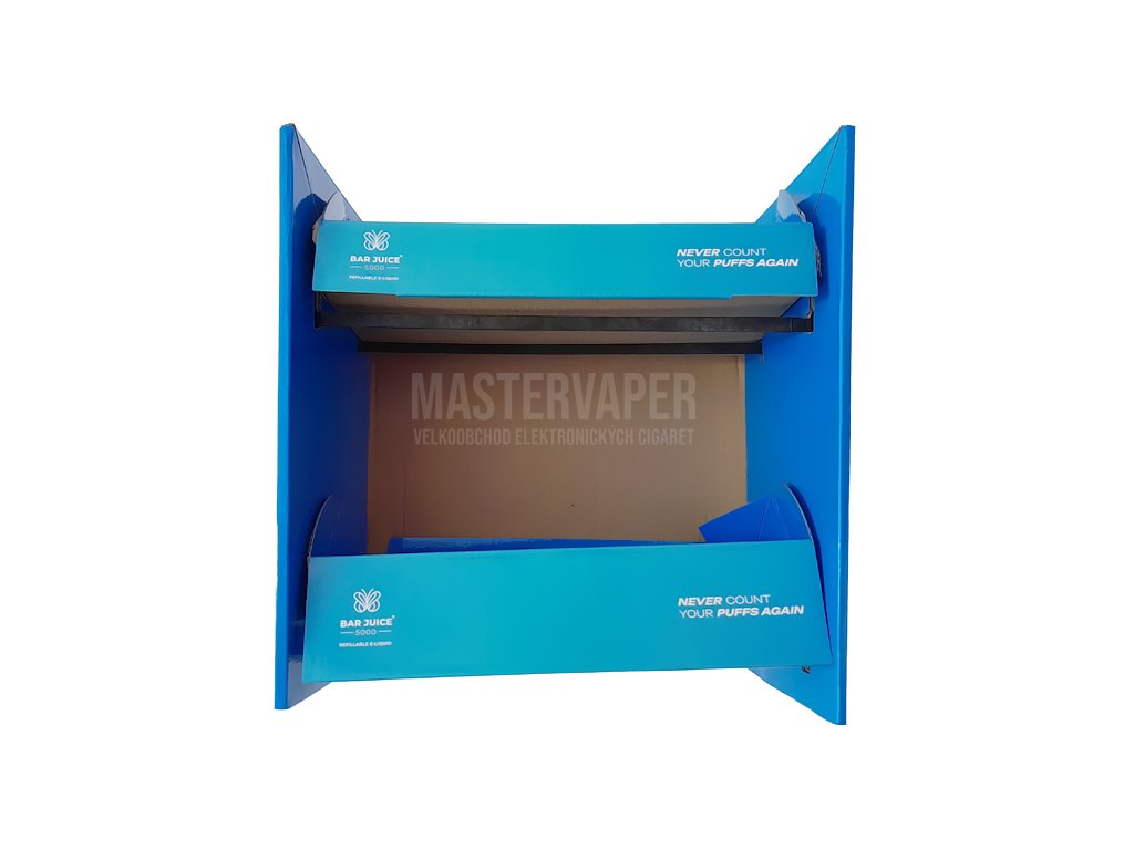 Bar Juice prodejní stojan navržený speciálně pro efektní vystavení produktů značky Bar Juice 5000. Stojan je vyroben z kvalitního materiálu v modré barvě s charakteristickým designem značky včetně loga "BAR JUICE" a motivačního sloganu "NEVER COUNT YOUR PUFFS AGAIN". Stojan nabízí dvoupatrovou konstrukci s praktickými policemi pro umístění produktů a zajišťuje optimální prezentaci sortimentu elektronických cigaret. Konstrukce je stabilní a poskytuje dostatečný prostor pro vystavení různých příchutí a variant produktů. Ideální řešení pro prodejny a vape shopy.
