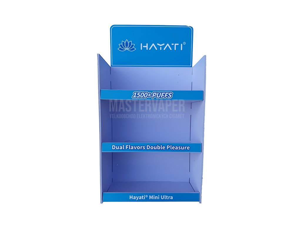 Stylový modrý prodejní stojánek značky Hayati určený pro maloobchodní prezentaci elektronických cigaret. Stojánek disponuje třemi praktickými policemi pro různé produktové řady