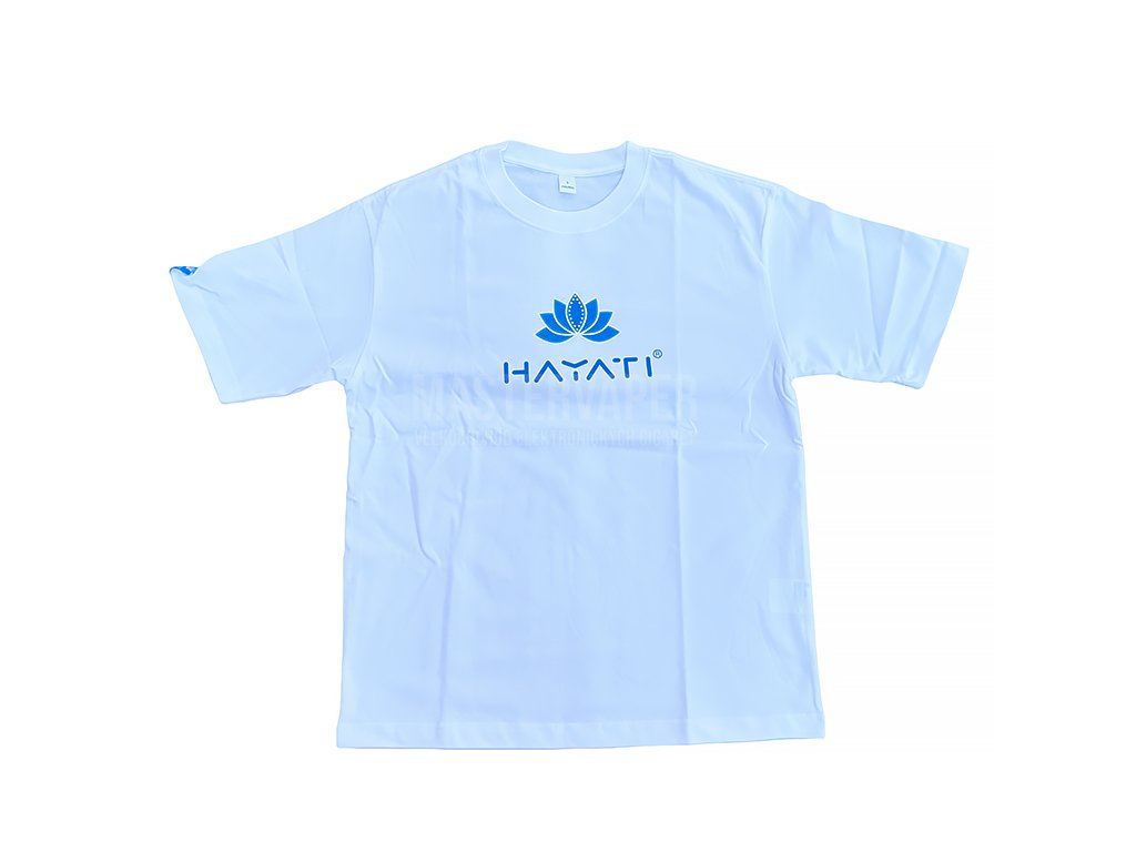 Stylové bílé tričko s krátkým rukávem od značky Hayati v univerzálním unisex designu. Na přední straně je umístěno charakteristické modré logo Hayati s elegantním lotosovým květem, na zadní straně se nachází motivační slogan "Enjoy Hayati® Enjoy Life" v modrém písmu.