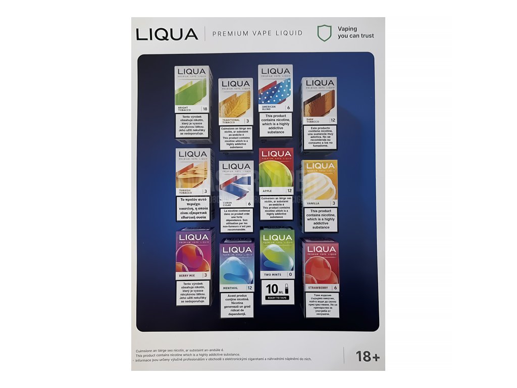 Informativní plakát A3 Liqua zobrazující 12 klasických příchutí prémiových e-liquidů s mottem "Vaping you can trust".