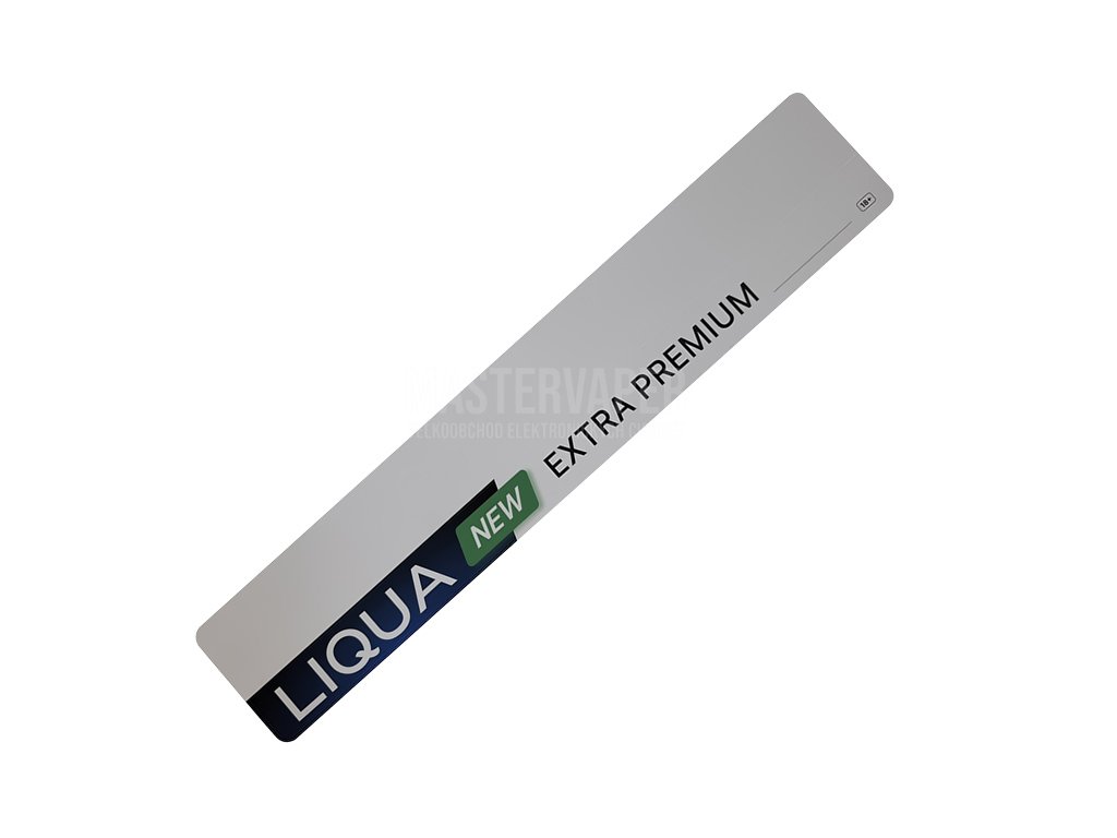 Minimalistický prodejní štítek pro prémiovou řadu e-liquidů Liqua Extra Premium. Štítek má protáhlý tvar s jednoduchou šedou základnou a výrazným nápisem "LIQUA EXTRA PREMIUM" černým písmem. Zelený akcent se slovem "NEW" upozorňuje na novinku v sortimentu. V pravém horním rohu je umístěno logo 18+. Design je čistý a profesionální, ideální pro označení cenových štítků, polic nebo jako součást prodejní prezentace. Pomáhá odlišit prémiovou řadu Liqua od standardních produktů a zvyšuje vnímání kvality produktu zákazníky.