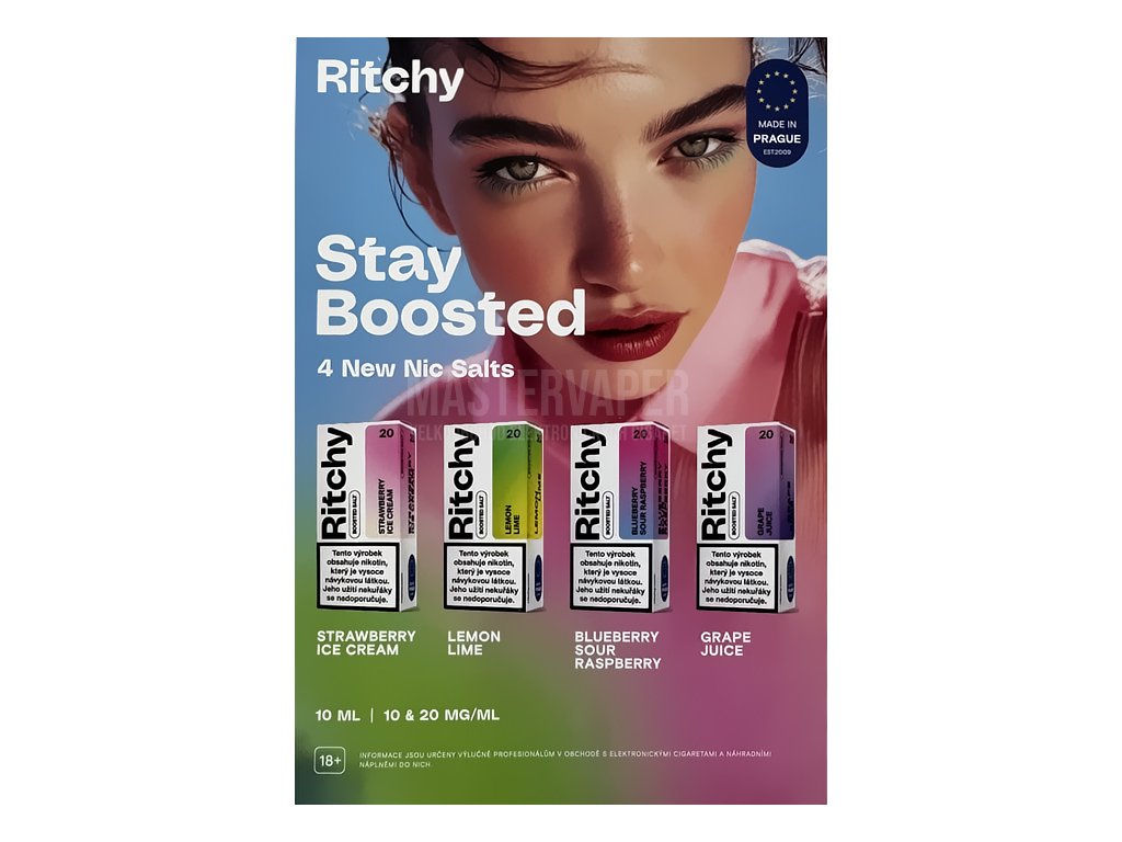 Výrazný propagační leták formátu A5 pro novou řadu nikotinových solí Ritchy. Leták má poutavý design s portrétem modelu a nápisem "Stay Boosted". Představuje 4 nové příchutě: Strawberry Ice Cream, Lemon Lime, Blueberry Sour Raspberry a Grape Juice. Každá příchuť je zobrazena na barevné lahvičce o objemu 10ml s dostupnými koncentracemi 10 a 20 mg/ml. Design je moderní s přechodem od zelené přes růžovou až po fialovou barvu. V levém horním rohu je vyznačeno "Made in Prague", což zdůrazňuje lokální výrobu. Ideální pro propagaci nových příchutí v prodejně nebo pro rozdávání zákazníkům.