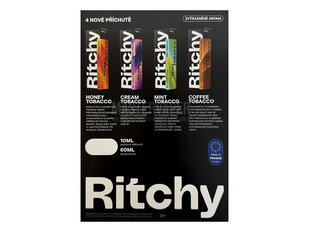 Profesionální propagační leták formátu A5 představující čtyři nové příchutě tabákových shake od značky Ritchy. Leták má černé pozadí pro elegantní vzhled a zobrazuje čtyři lahvičky s příchutěmi: Honey Tobacco, Cream Tobacco, Mint Tobacco a Coffee Tobacco. Každá příchuť je detailně popsána v českém jazyce s vysvětlením charakteru chuti. Leták zdůrazňuje objem 10ml s možností přidání příchutě a 60ml celkového objemu balení. V pravém dolním rohu je umístěno logo "Made in Prague" EST.2006, což potvrzuje dlouholetou tradici značky. Ideální pro zákazníky hledající autentické tabákové příchutě se zvýrazněným aroma.