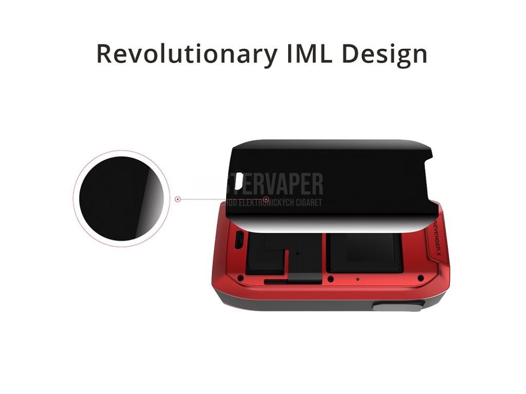 Druhá verze úspěšného gripu Revenger na sebe nenechala dlouho čekat. Revenger X přináší tři zásadní novinky. První dvě se doslova skrývají ve spínači a regulačních tlačítkách. Jedná se o jednoduché ovládání a spínání bez klasických tlačítek. Lehkými stisky na prostřední část gripu (viz foto) si vybíráte požadované funkce, a díky vibračnímu čipu poznáte, že nastavení proběhlo úspěšně. Dotykový senzor spínače je umístěn pod regulátory. Třetí novinka je nastavení jasu 16-ti stupni. Revenger X nabízí velký výběr režimů, od klasického VW (výkon) a TC (teplotní režimy) až po nastavení různých hodnot výkonu či teploty v prvních 5-ti vteřinách potahu. Velký 0,96 palcový displej Vám kromě zobrazení potřebných údajů pro vaping umožní nastavit reálný čas v podobě RTC režimu. Vyměnitelné monočlánky typu 18650 (2ks, min 25A) poslouží jako zdroj energie. V této sadě nalezneme clearomizer NRG Mini o kapacitě 2ml. Využívá systém horního plnění - po odsunutí vrchní části, plníte liquid otvorem přímo do těla clearomizeru. Celý clearomizer je plně rozebíratelný = snadná údržba. Jeho velkou předností jsou žhavicí hlavy GT, které přináší velkou kouřivost a autentickou chuť liquidu. Žhavicí spirálky jsou obaleny v organické bavlně a zapuštěny do keramického těla. Regulace přívodu vzduchu pro nastavení optimální kouřivosti se nachází ve spodní části.