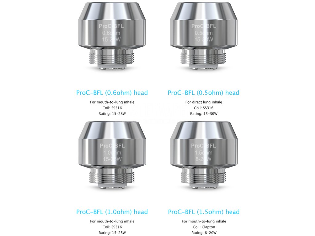 Atomizer ProC-BFL o odporu 0,5ohm (15W-30W) ze 100% organické bavlny, navržený speciálně pro styl potahování přímo do plic. Ve spolupráci s Cubis 2 clearomizerem přináší objem nádržky 2ml. Kompatibilní s BF (Joyetech Cubis, Cubis PRO).