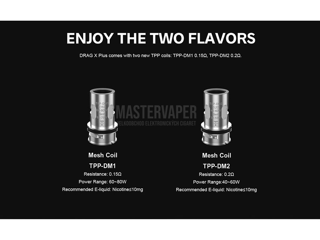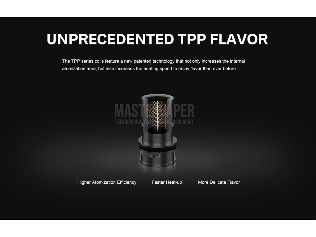 Nové DL žhavící hlavy Voopoo TPP, využívající obousměrnou konvenční strukturu vzduchových cest pro maximalizaci celkové účinnosti atomizéru. Mesh spirálky řady TPP využívají novou patentovanou technologii VooPoo (technologie rozprašování "dual in one"), která zvětšuje atomizační plochu uvnitř spirálek a zároveň zlepšuje rychlost žhavení. Doporučený výkon 60-80W.